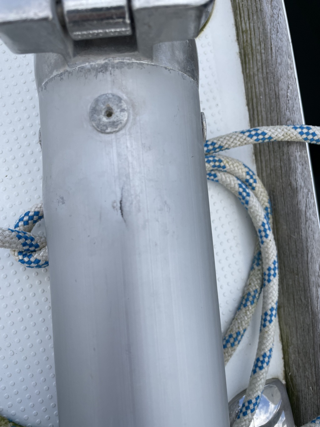 Autre interrogation et avis bienvenus. Il faut savoir que lorsque l'espar n'est pas utilisé il est positionné sur le pont et bloqué grâce à des pions vissés sur le pont. Quand on regarde le montage au repos on s'aperçoit qu'il y a un une pente négative de l'avant du bout vers l'arrière. Donc si humidité ou pluie, ça taille vers l'arrière, là ou j'ai eu le problème d'électrolyses. Je ne crois pas au hasard ....
