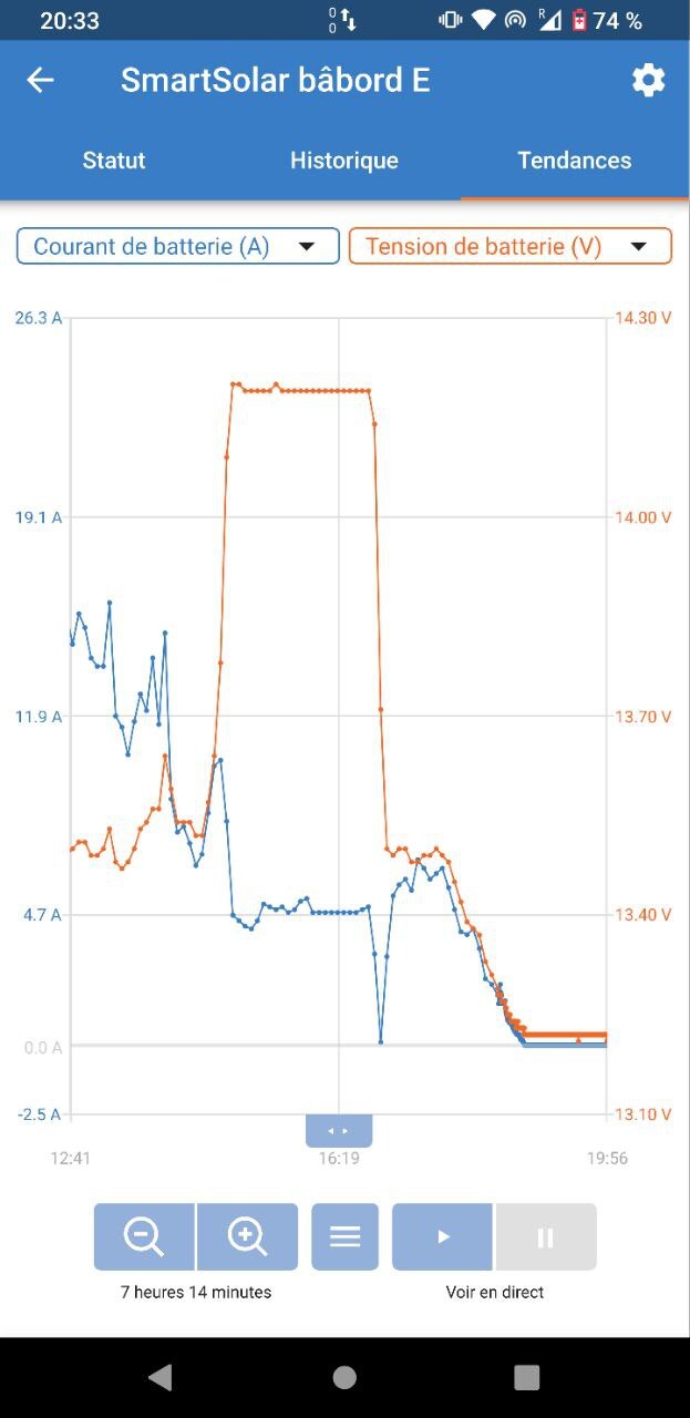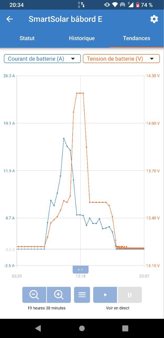 Mon installation avec de nouveaux panneaux solaires fonctionne bien. J'ai limité la tension à 14,2 volts sur mes deux SmartSolar, réglés pour des batteries Lithium. Et tous les jours cette limite est atteinte.