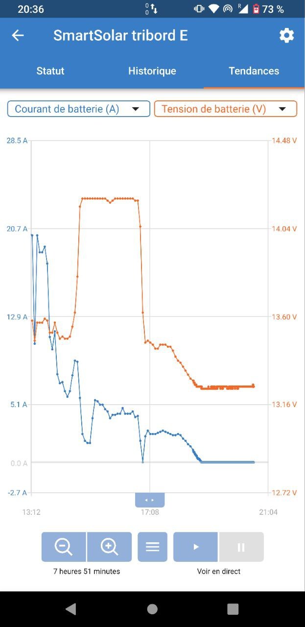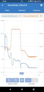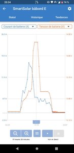 Menkar:Oui, oui, je note de faire une charge à 14,4 ou 14,6 deux fois par an, aucazou, et je vais baisser la limite à 13,65 ... je vais aussi regarder plus spécialement si l'algorithme de charge (n°7 = Lithium) de Victron fait redescendre la tension après avoir atteint les 14,2·le 13 nov. 13:27