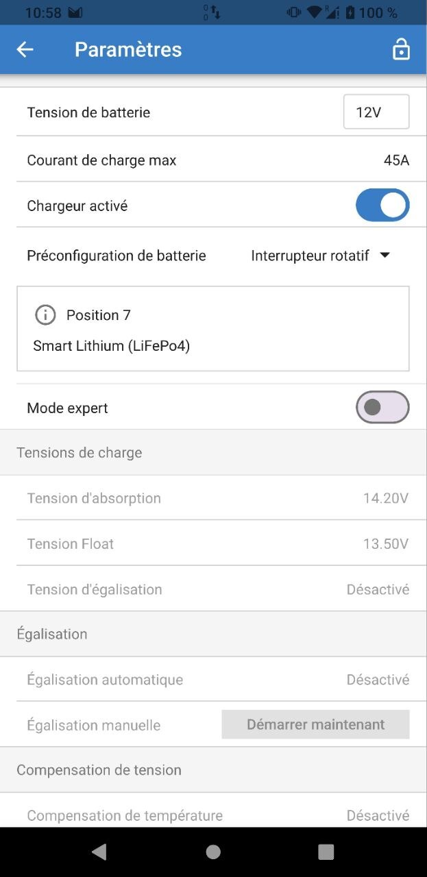 Fabien83:Surtout pas d'egalisation avec des batteries LFP ! Pas non plus de compensation en température. ·le 20 nov. 07:34