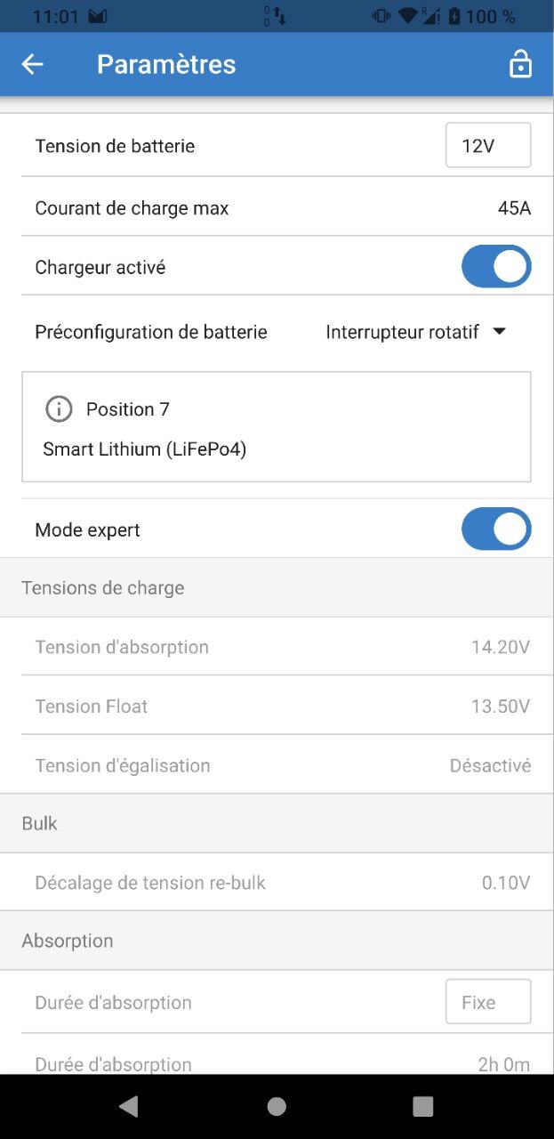 Tension d'absorption : 14.2v (en fait c'est la tension donnée par Victron dans sa préconfiguration pour les LiFePo4), durée d'absorption maximale : 30 mn, tension de float : 13.4v (de base Victron met 13.5v).