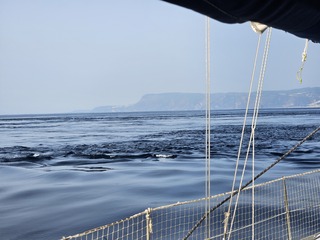 Dans les zones où le courant est le plus fort, qui peut facilement atteindre 5 noeud, il y a un enchaînement de "tâches d'huile" sans vague alors que nous avions 15n de vent. J'imagine que ce sont les courants descendant. Il y a aussi juste à côté des zones où l'eau frétille comme si des centaines de poissons étaient à la surface. Je suppose que c'est le courant ascendant. Notre bateau ne s'est pas fait aspirer par le fond cependant ! Voir la photo d'illustration, mais c'est plus parlant en vrai. Spectacle aussi étrange qu'inoubliable.