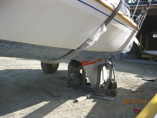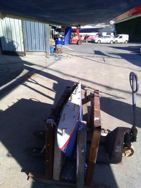 Le bateau doit être parfaitement calé en hauteur. La quille posée sur un plateau hydraulique résistant à bien plus que la masse de la quille et étayée, pour ne pas tomber brutalement lorsque tu découpes.