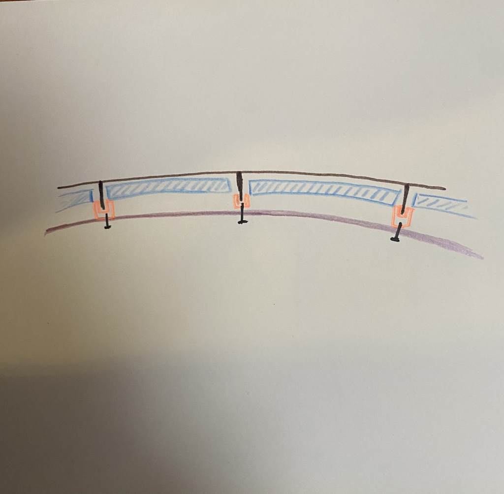 Je vous joins un dessin en coupe montrant la construction du bateau : la coque en aluminium est représentée en brun, l’isolant en bleu, et en orange fluo, ce sont les lattes de bois fixées sur les renforts de pont, sur lesquelles sont vissés les vaigrages en contreplaqué (vis dessinées en noir).