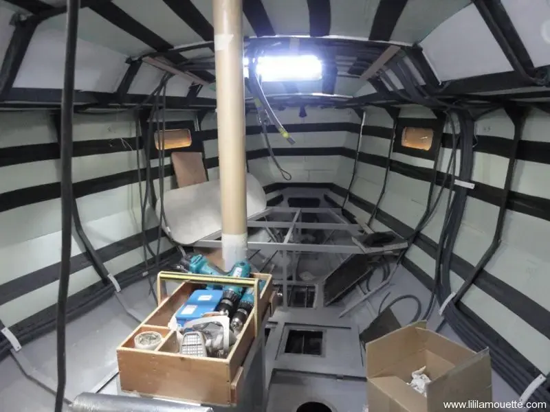 L’isolation actuelle est constituée de plaques de polystyrène de 30 mm recouvertes d’une couche de papier bulle. Cependant, cette isolation n’étant pas en contact direct avec la coque, elle laisse se former de la condensation entre le polystyrène et le métal.