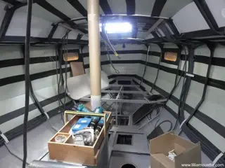 Ce qu'on a c'est chauffage central hydronic au fuel avec des radiateurs, et un poêle à bois. Ça permet de bien chauffer et surtout, on laisse le cockpit fermé par des toiles plus ou moins ouvert pour assurer une ventilation. Les manches à air sont nombreuses. Pour l'isolation, ce sont des feuilles multicouches.