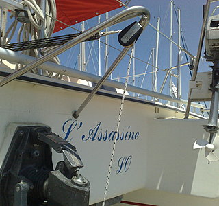 Le pendulum entre les coques, une tringlerie sur un tube inox relié aux deux safrans, un tube vertical qui cache la tige de l'aérien, et l'aérien au dessus du toit! Il y a moyen de règler la réactivité de l'aérien avec un petit sandow pour éviter des sursauts trop brusque.