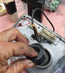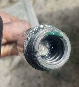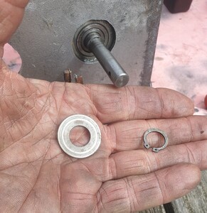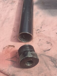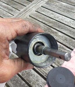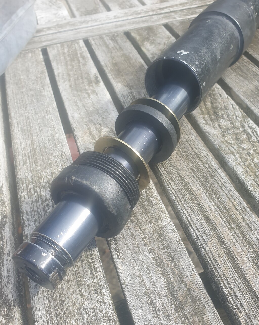 Il faut alors repositionner le corps du vérin dans le tube extérieur après avoir positionné les 2 bagues en acier et la rondelle en caoutchouc comme sur la photo 8 puis le revisser