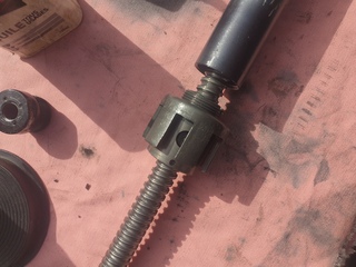 On commence par revisser légèrement la vis sans fin dans la cage à billes(photo 3); juste suffisamment pour que les billes que vous allez introduire par le haut ne puissent pas s'échapper. Attention au sens de vissage de la tige filetée dans la cage! Prenez des notes lors du démontage (je m'y suis repris à 2 fois...)