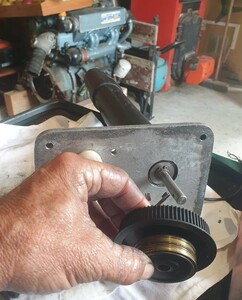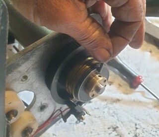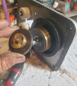 On repositionne alors la rondelle de frottement puis le circlips en sortie de tige filetée (photo 13); ainsi que la poulie crantée et la bobine magnétique d'embrayage (photo 14)