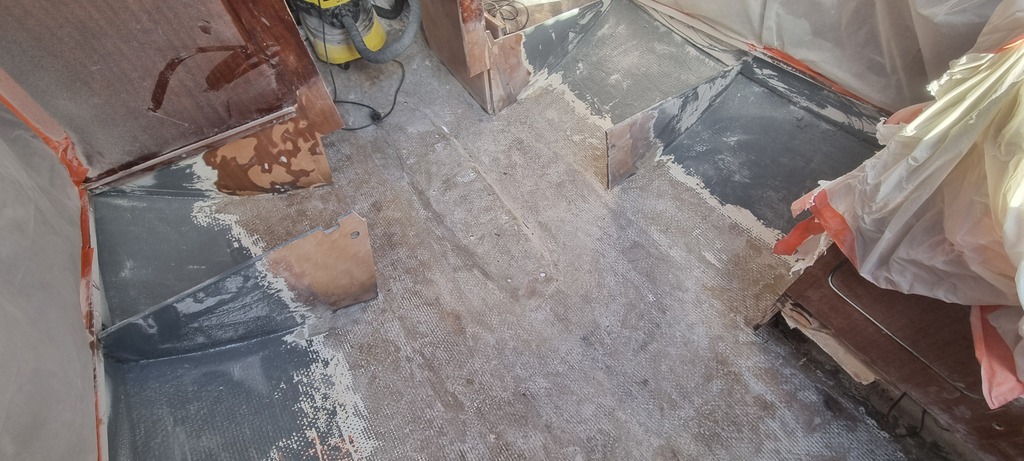 Donc fin du ponçage quasi à 100% avec des mauvaises surprises : les cloisons de banquettes sont HS, le ctp marine noirci d'humidité ainsi que le bas de la cloison de l'évier...