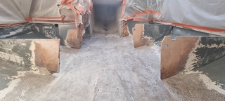 Prochaine étape : Finir de décaper le fond de coque jusqu'à la descente vers l'arrière et la couchette vers l'avant + Décaper les bas de menuiseries sur 20 cms pour les retours de strat du fond et des varangues + décapage des intérieurs de menuiseries pour bien transmettre les efforts le plus "haut" possible.
