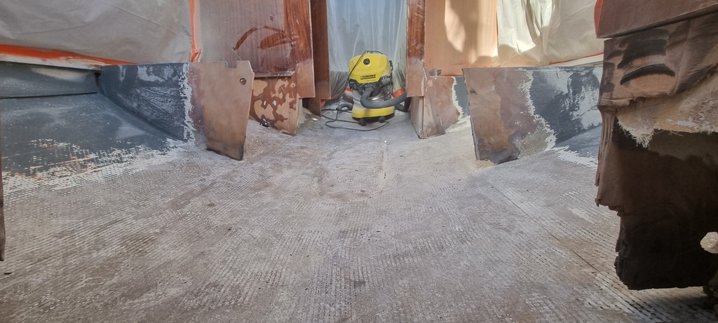Décapage du fond de cale. en plein milieu du job, je me suis rendu compte que ce qui est décris dans la vue en coupe d'époque comme renfort lest était en fait 5mm de start avec du uniquement du mat (aucun tissu tissé)... Donc, j'ai pris la décision de tout retirer (+3H de taf..) et de ne garder que la coque.