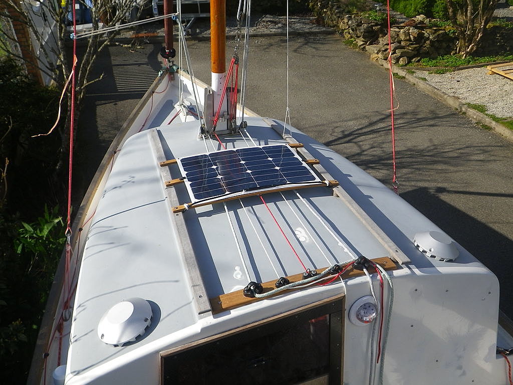 Par contre, je ne suis pas convaincu par la solution du panneau souple posé sur le pont. Invariablement, il est à moitié à l'ombre et ne produit plus grand chose à ce moment-là. Je vais le stratifier pour le rendre rigide et le mettre sur un matereau à l'arrière.