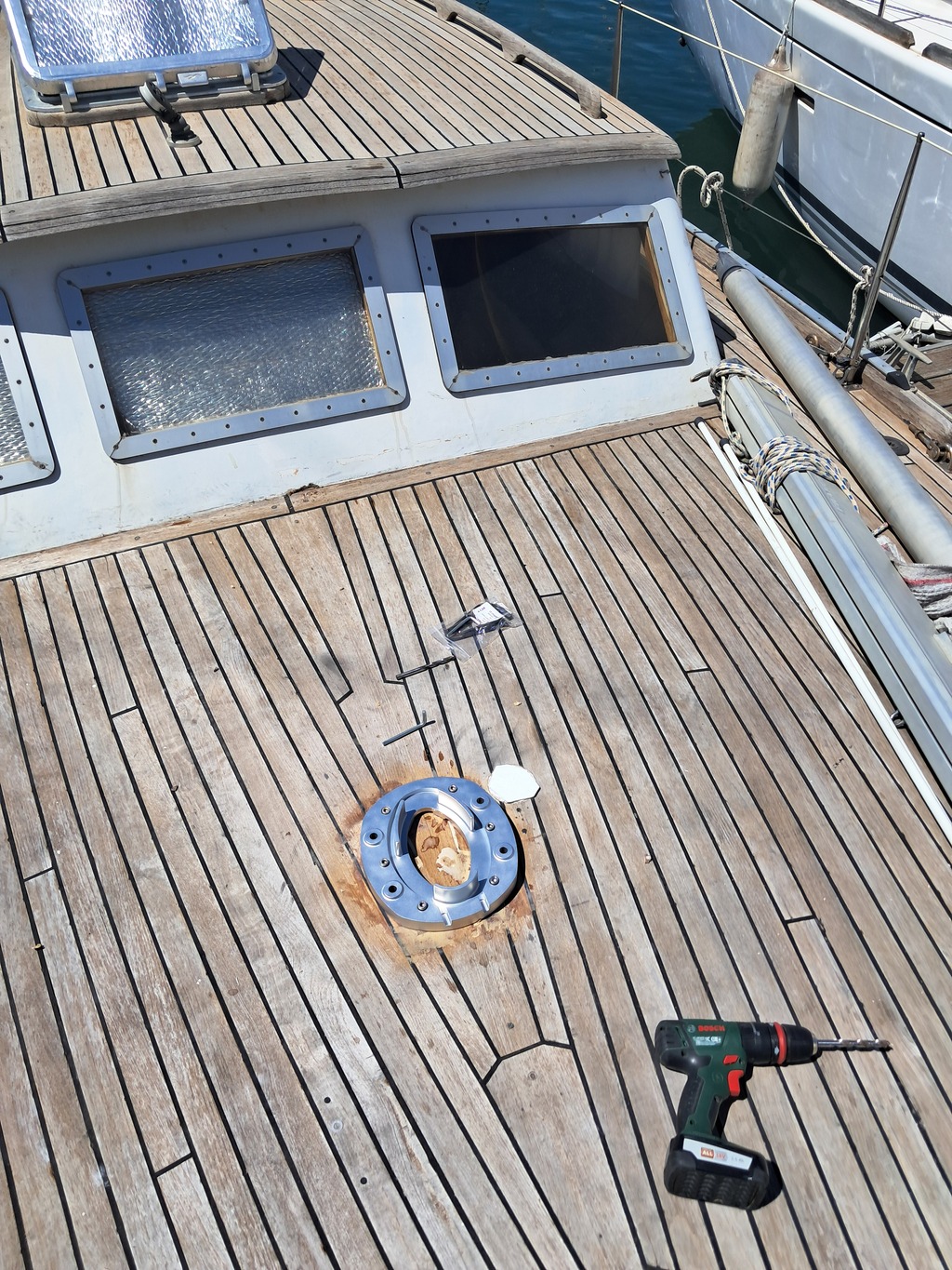 Et maintenant, la partie la plus délicate, repositionner l'emplanture pour retrouver la verticalité du mat sur un pont qui a travaillé avec le temps et déformé par la corrosion de l'emplanture qui a creusé le teck.