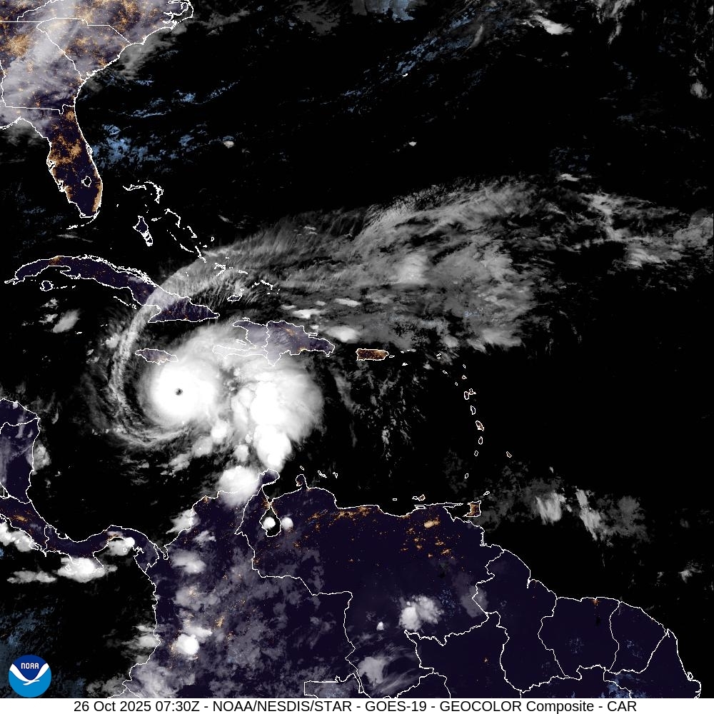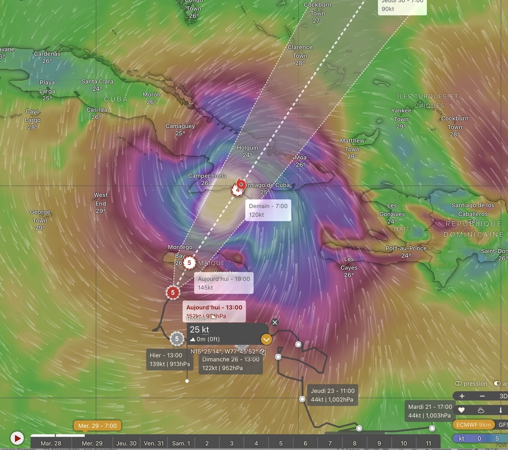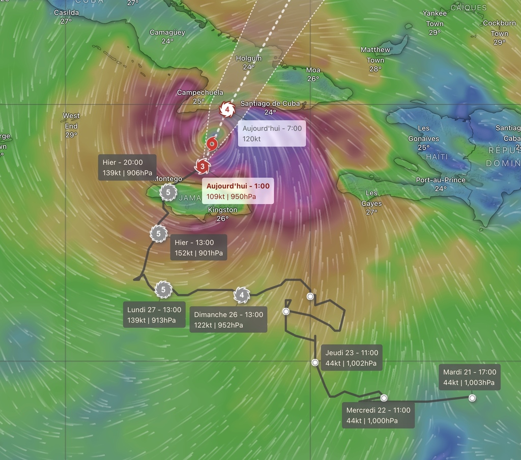 La tendance ce mardi 28 Octobre 2025 à 14h est le milieu de la Jamaique puis la pointe Est de Cuba avec un affaiblissement des vents à 120 nds, puis 90 nds en quittant Cuba?