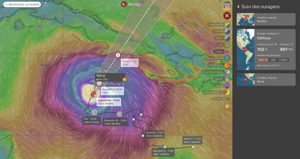 Dans le cas de cet ouragan Mélissa, on peut suivre les hésitations et les trajectoires de ce machin qui est presqu'à 900 Hpa avec une vitesse lente.