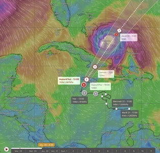Et bien maintenant c'est pile poil sur la Martinique avec des vents de 80 knts,