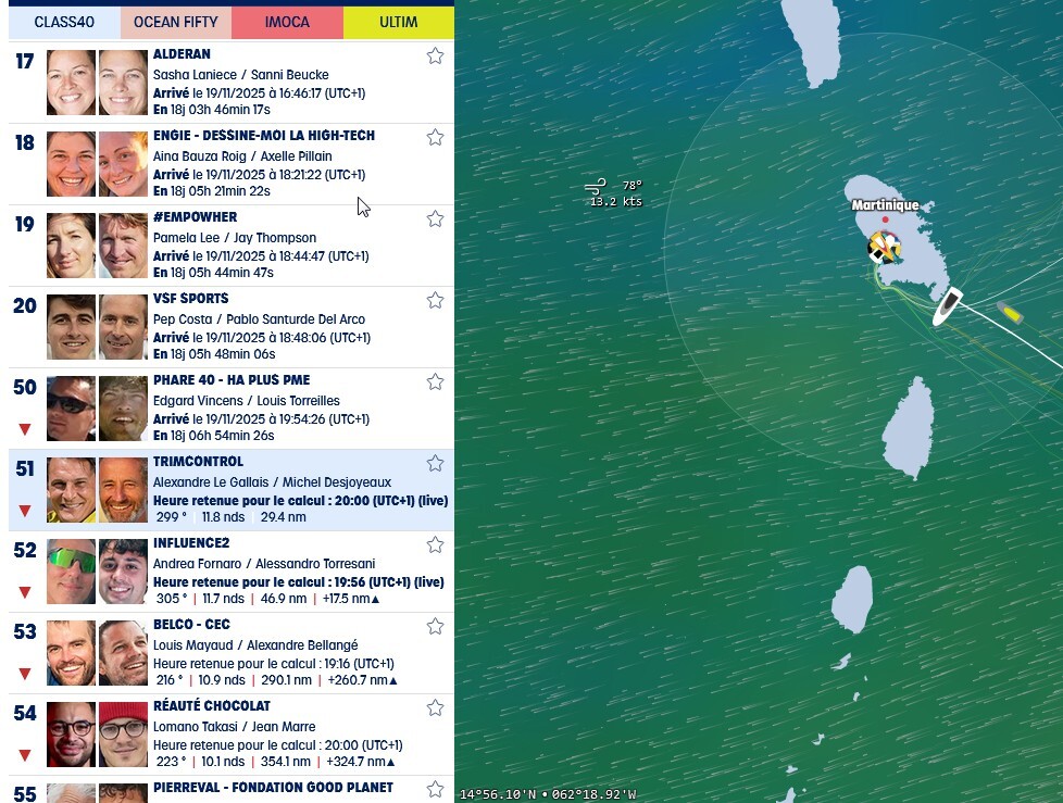 Ne connaissant pas la Martinique je ne sais pas si la côte sous le vent peut jouer un rôle pour l’arrivée des class 40.j peu comme l’est la Guadeloupe pour la route du rhum.
