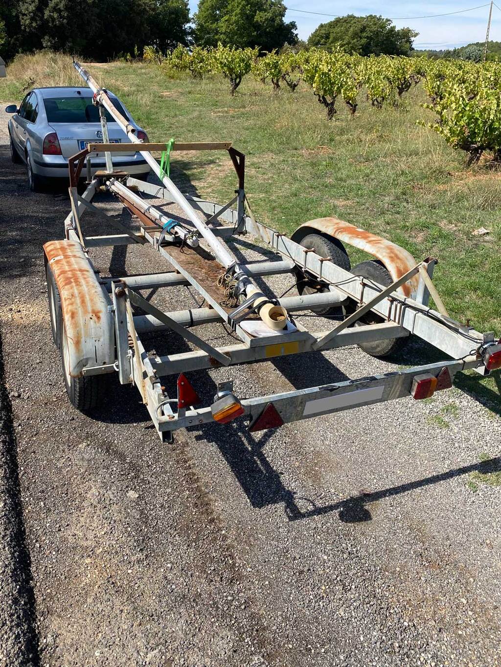 Si tu devais le refaire, je te suggère de reculer le mât pour que le pied de mât arrive au niveau de la plaque et de le fixer sur la traverse arrière de la remorque, et d'ajouter un brêlage vers le bas au niveau du portique.