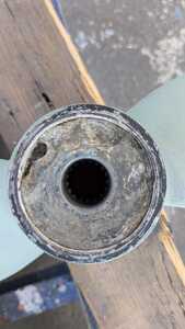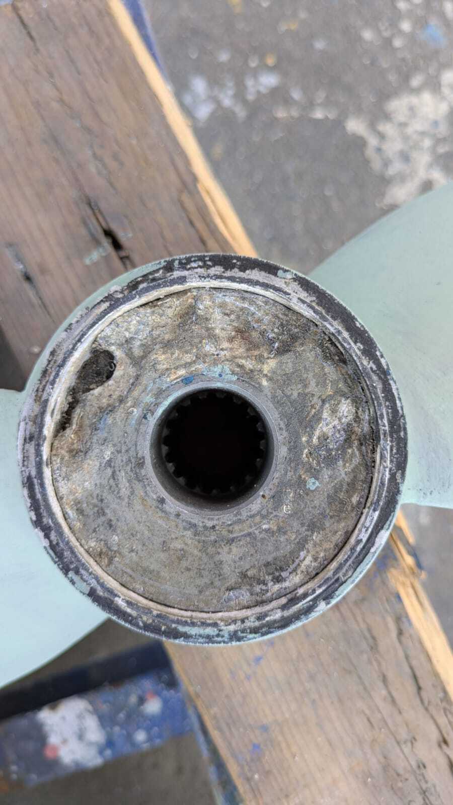 Si tu as l'hélice d'origine Volvo possibilité de dénoyautage, car entre l'empreinte grenelée et l'hélice il y a du caoutchouc qui est là pour faire "fusible en cas de choc afin d'éviter la deterioration de Saildrive. Il y a donc décollement de caoutchouc.