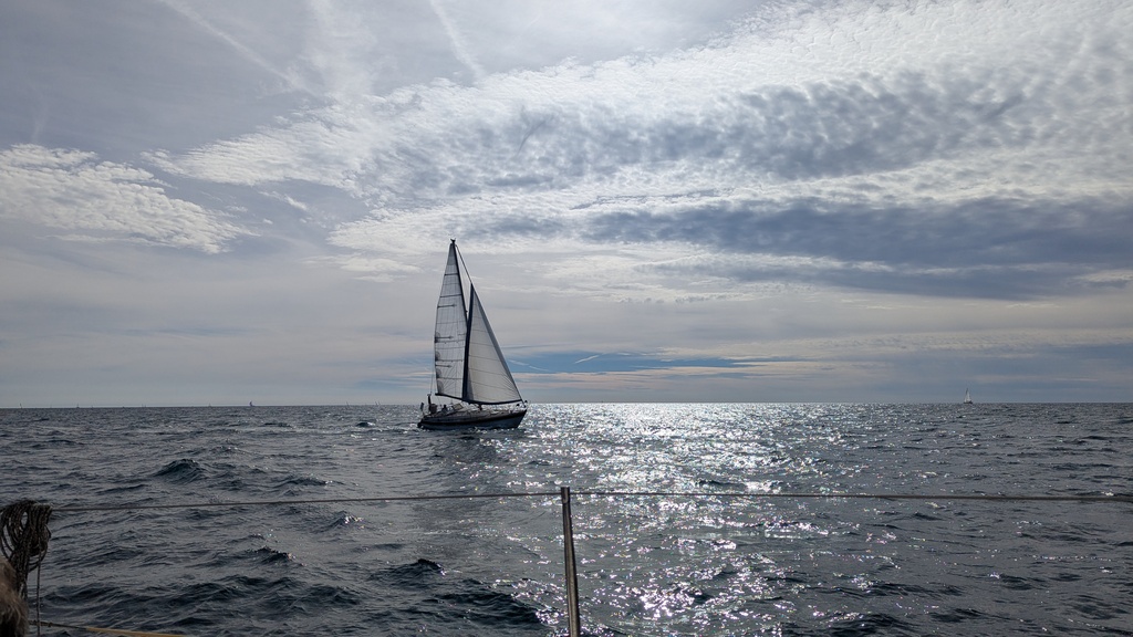 Nous sommes partis devant au près et le tri nous prend en chasse une centaine de m derrière.