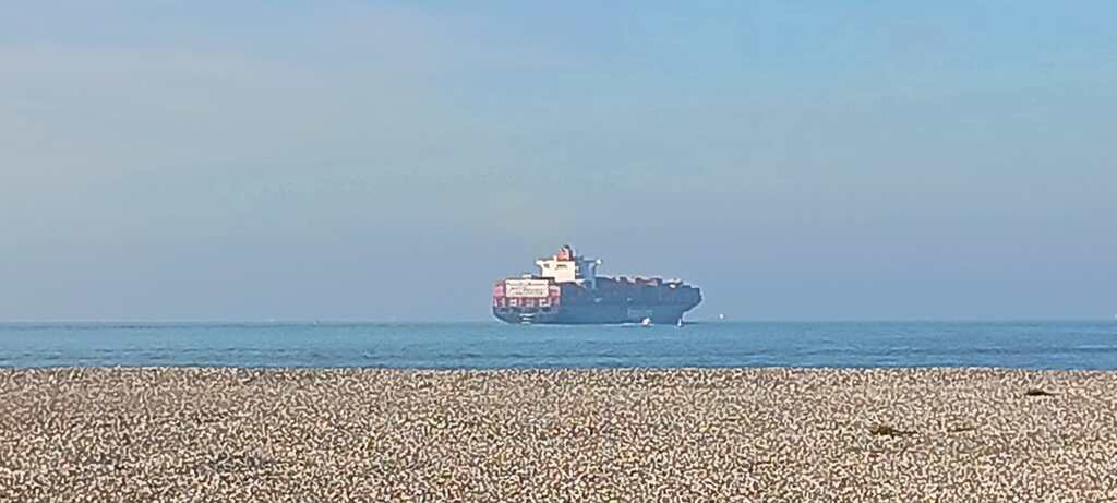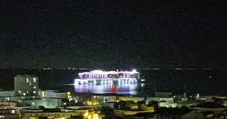 Paquebot, encore, qui sort de l’ombre et sans doute pour se faire pardonner quelqu’ outrance, s’illumine en guirlande marine.