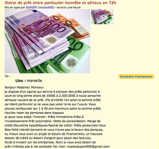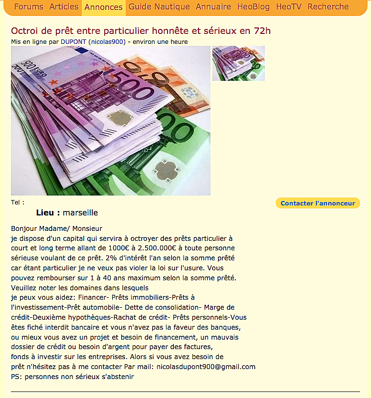 Incursion soudaine en tête de liste des fils de la Taverne, avec 0 au compteur des intervenants, d'un post par un certain Nicolas Dupont offrant des possibilités de prêts pouvant intéresser Madeleine Gadoupe et Jules Tapioca dans la fourchette 1000-2.500.000 Euros rien que ça.:whaou: