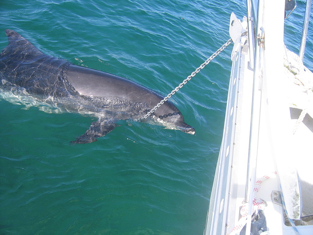 Il protège aussi l'humain , Vu à sein , pour ceux qui connaissent , il y a qq années un dauphin empêchant trois kayakistes de quitter l'ile pour rejoindre la baie des trépasses (ils avaient eu l'intelligence de traverser le raz de sein par grand beau temps le matin) fin d'après midi , le vent se levait. Le dauphin leur a fait barrage et s'est excité ensuite sur des embarcations au mouillage en venant les frapper de son museau et en les poussant au maximum de leur corpmort sans voulait il faire remarquer qq danger , mais il est fréquent de voir des bancs de dizaines de dauphins très calmes nous accompagner des dizaines de minutes du sud au nord gascogne ou en manche ou mer d'irlande , là aussi on les voit faire des sauts en vrille ,mais malgré des décennies de navigation ,il ne m'est jamais venu à l'idée de nager parmi eux , comme dit fritz the cat ce sont des bêtes sauvage